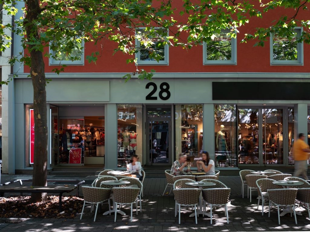 Unsere Tür mit der markanten Nummer 28 befindet sich direkt gegenüber den Arcaden in der Fußgängerzone von Erlangen.